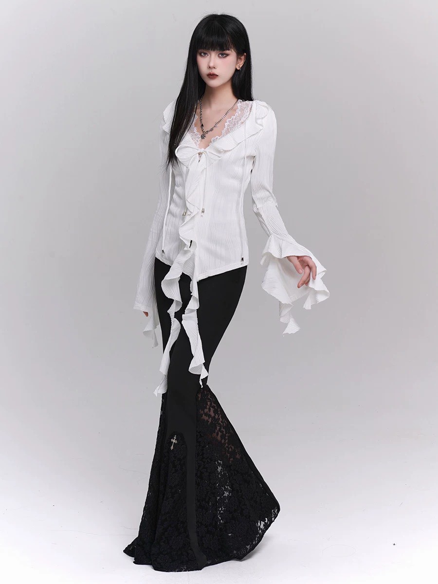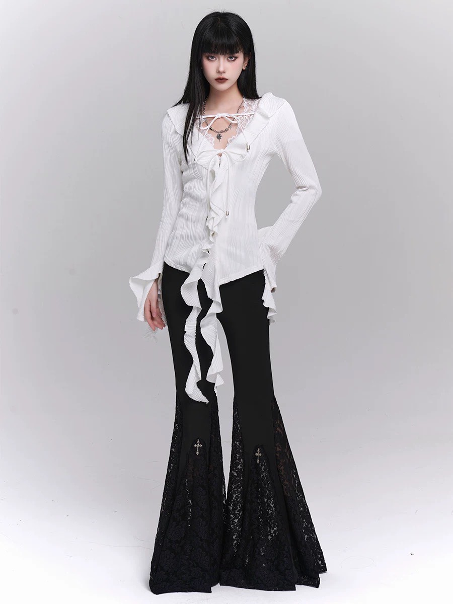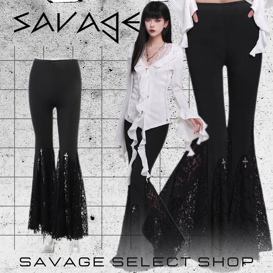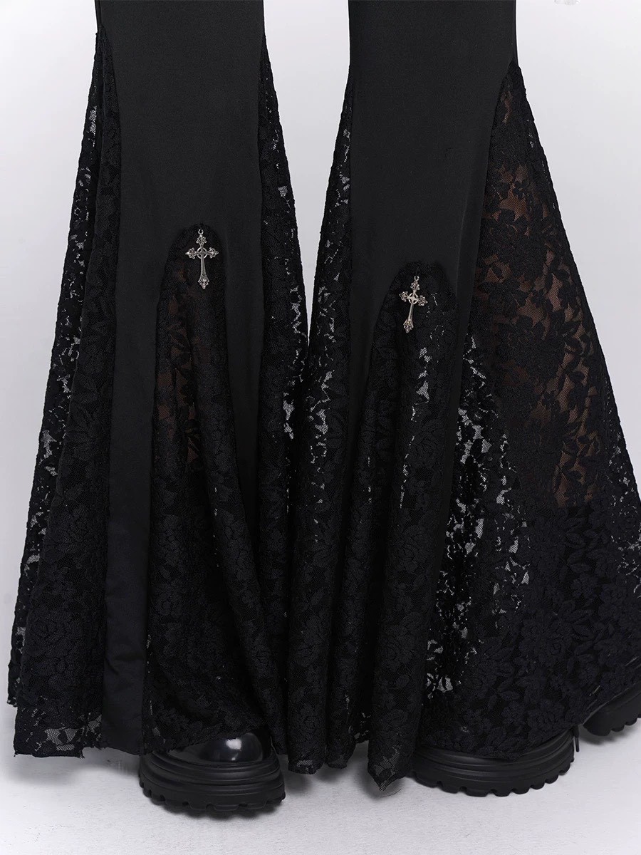 #下身 #褲子 #長褲 #彈性 #喇叭褲 #蕾絲 #拼接 #十字架 #顯瘦