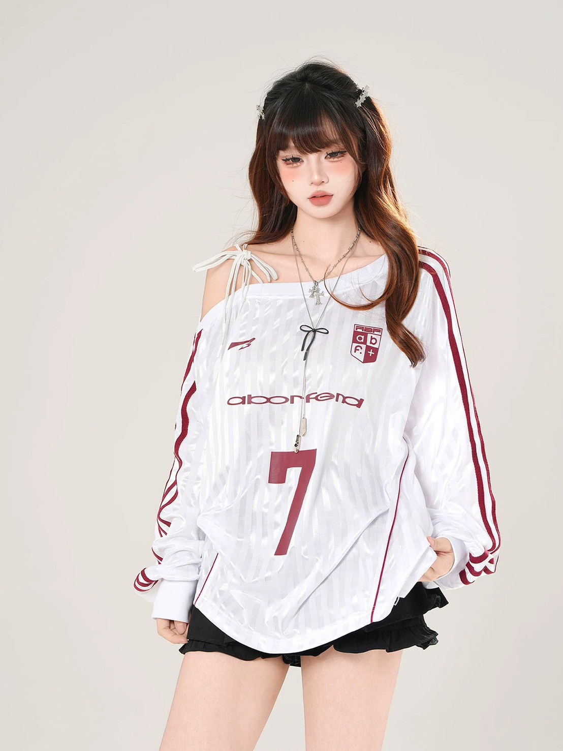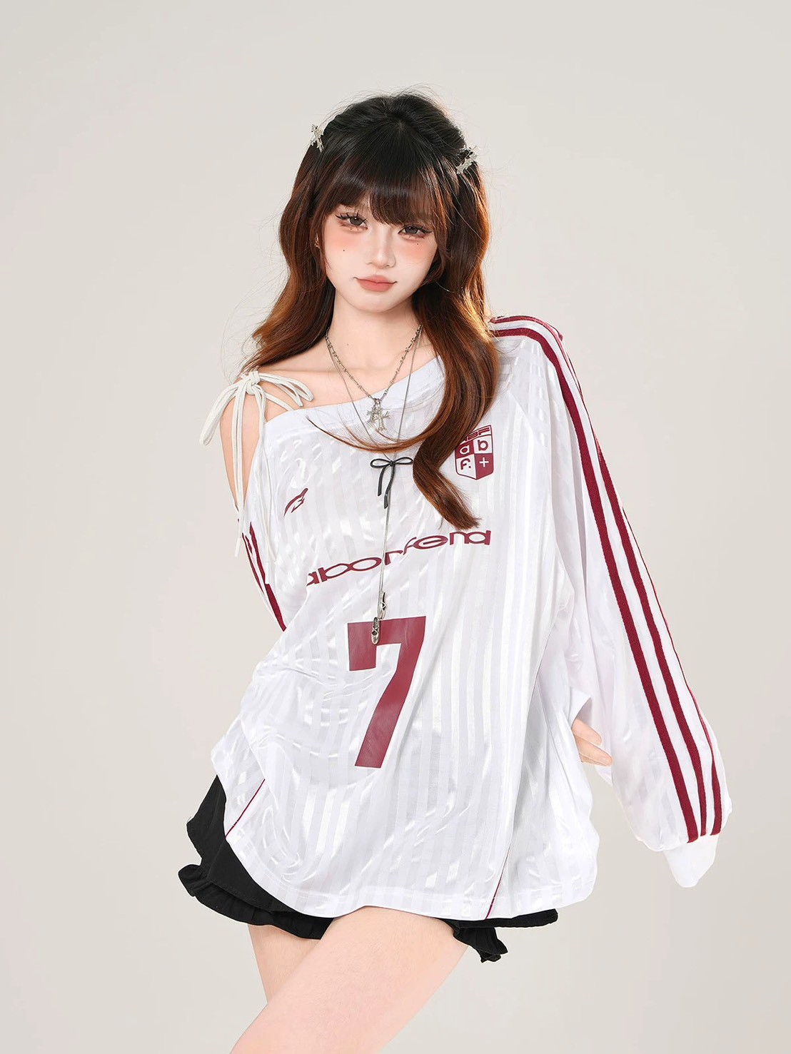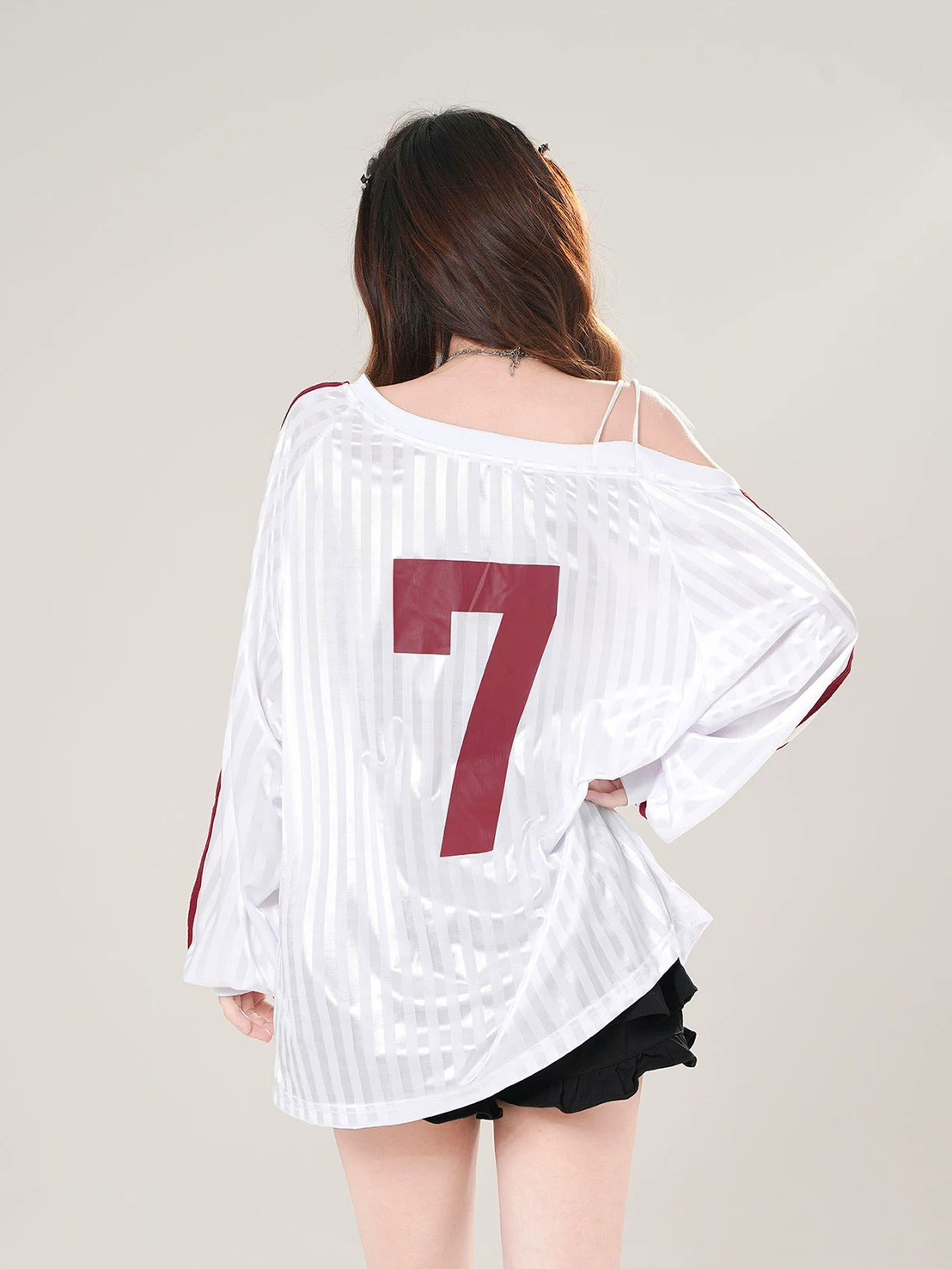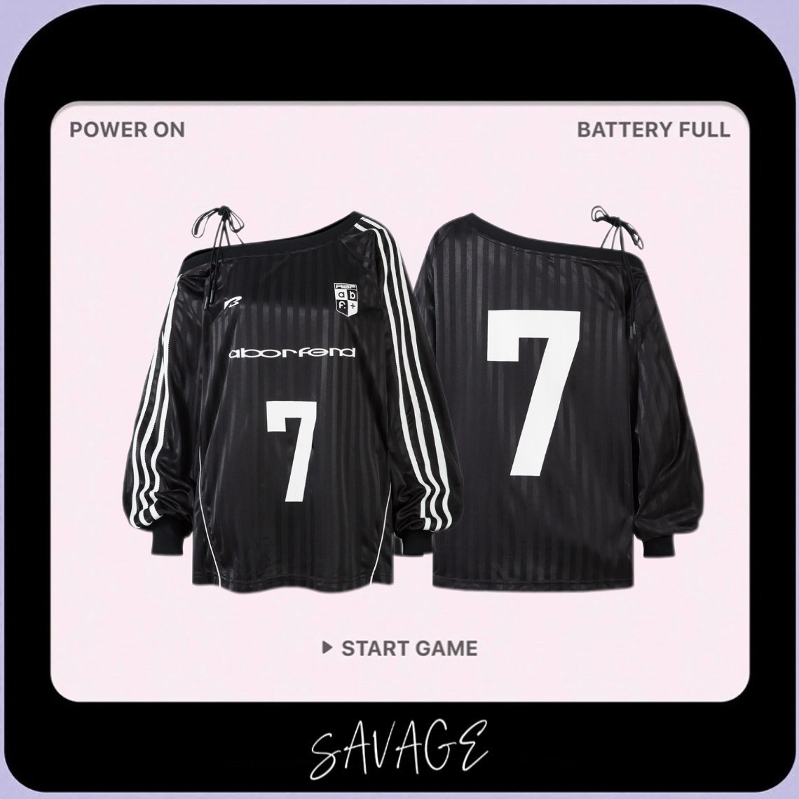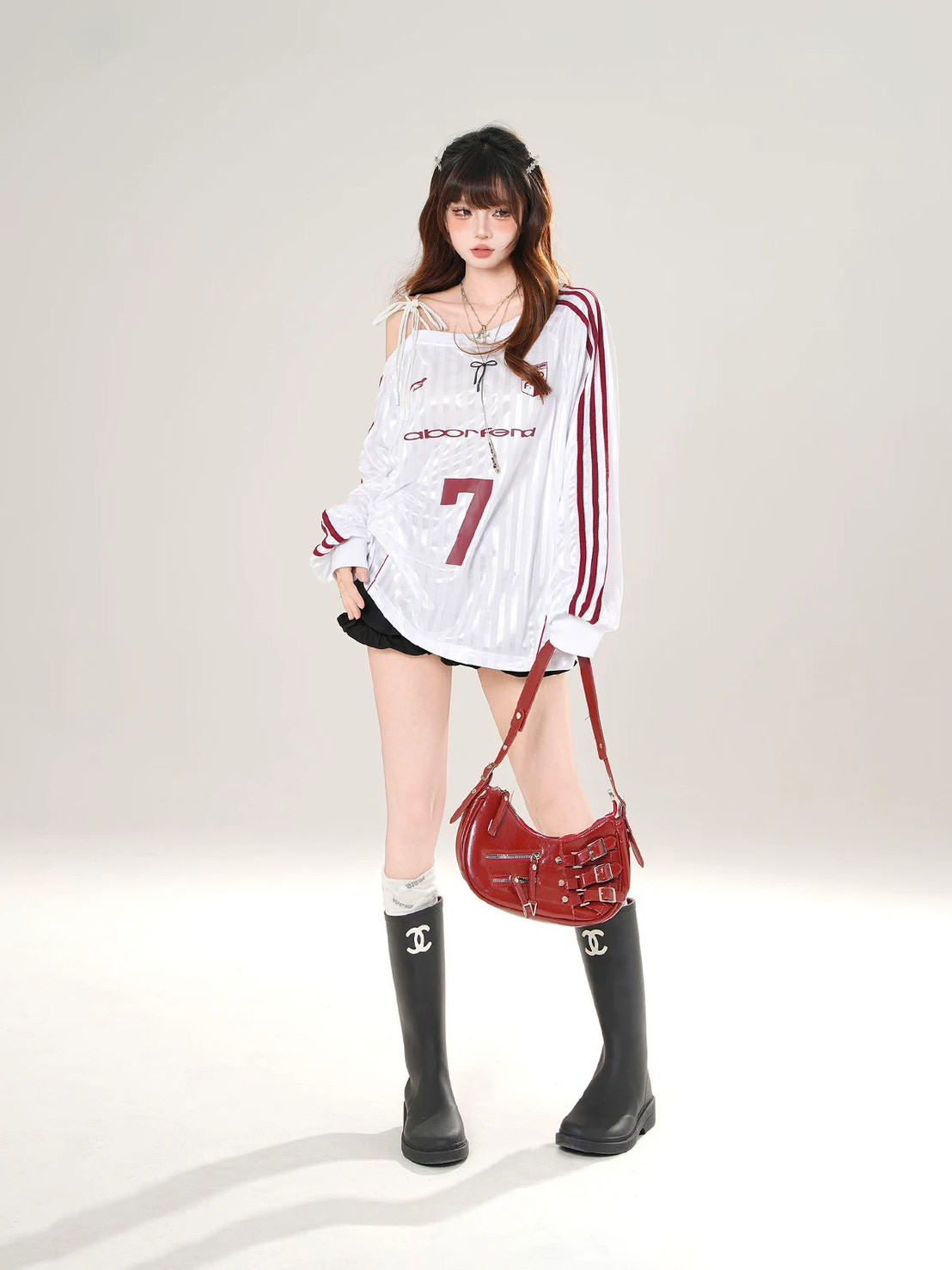 #上身 #長袖 #緞面 #印花 #綁帶 #球衣 #條紋 #寬鬆 #斜肩