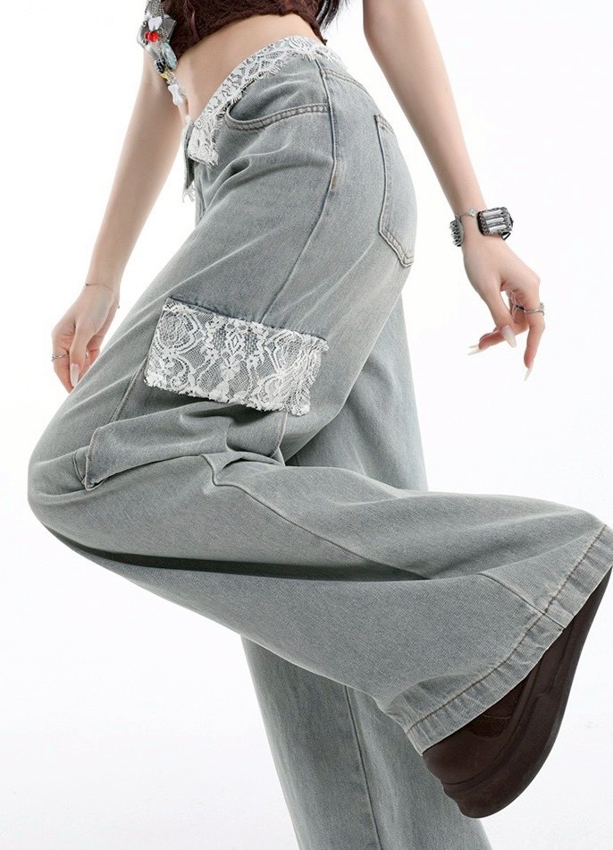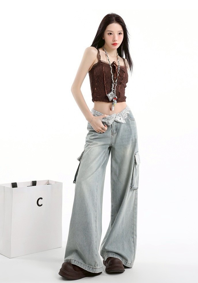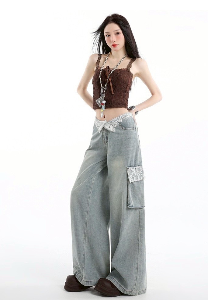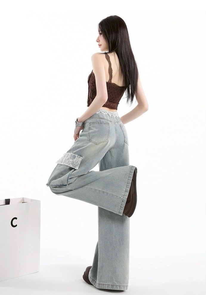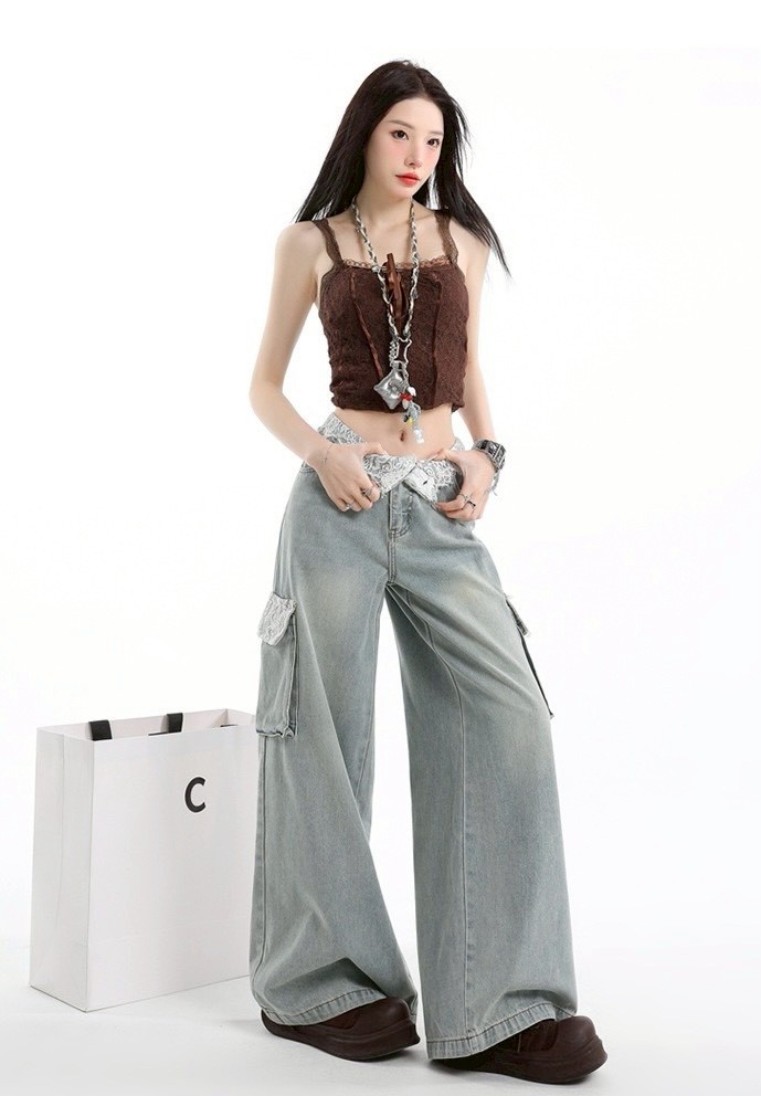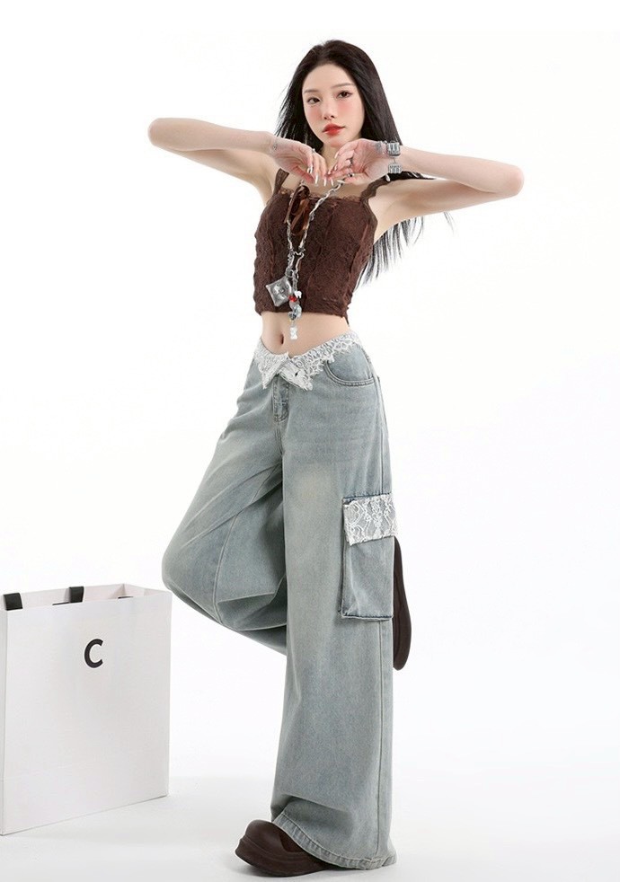 [商品名稱]:蕾絲拼接工裝牛仔褲
